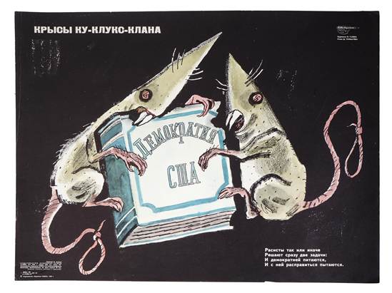 A Soviet poster reads, “Rats of the Ku Klux Klan: American Democracy.”