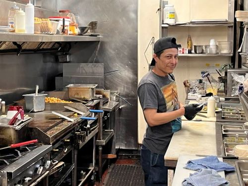 These days the brunch at Julia’s is still delicious, but the joint is no longer open for dinner. The once-bustling restaurant—with cooks, prep chefs, multiple wait staff—seemed to have a late-morning crew of one cook and just two waitresses. Surely there was a dishwasher somewhere, but the plates were piling up when I posed for a photo in my old work station.
